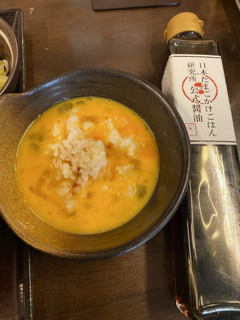 といた卵の中にご飯を落として、机に備え付けされてる醤油をかけて食べる!